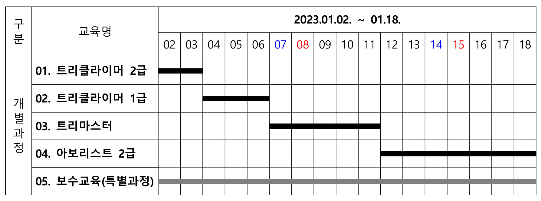 - ±³À°±â°£ : 2023³â 01¿ù 12ÀÏ (¸ñ¿äÀÏ) ~ 01¿ù 18ÀÏ (¼ö¿äÀÏ) - 6¹Ú 7ÀÏ